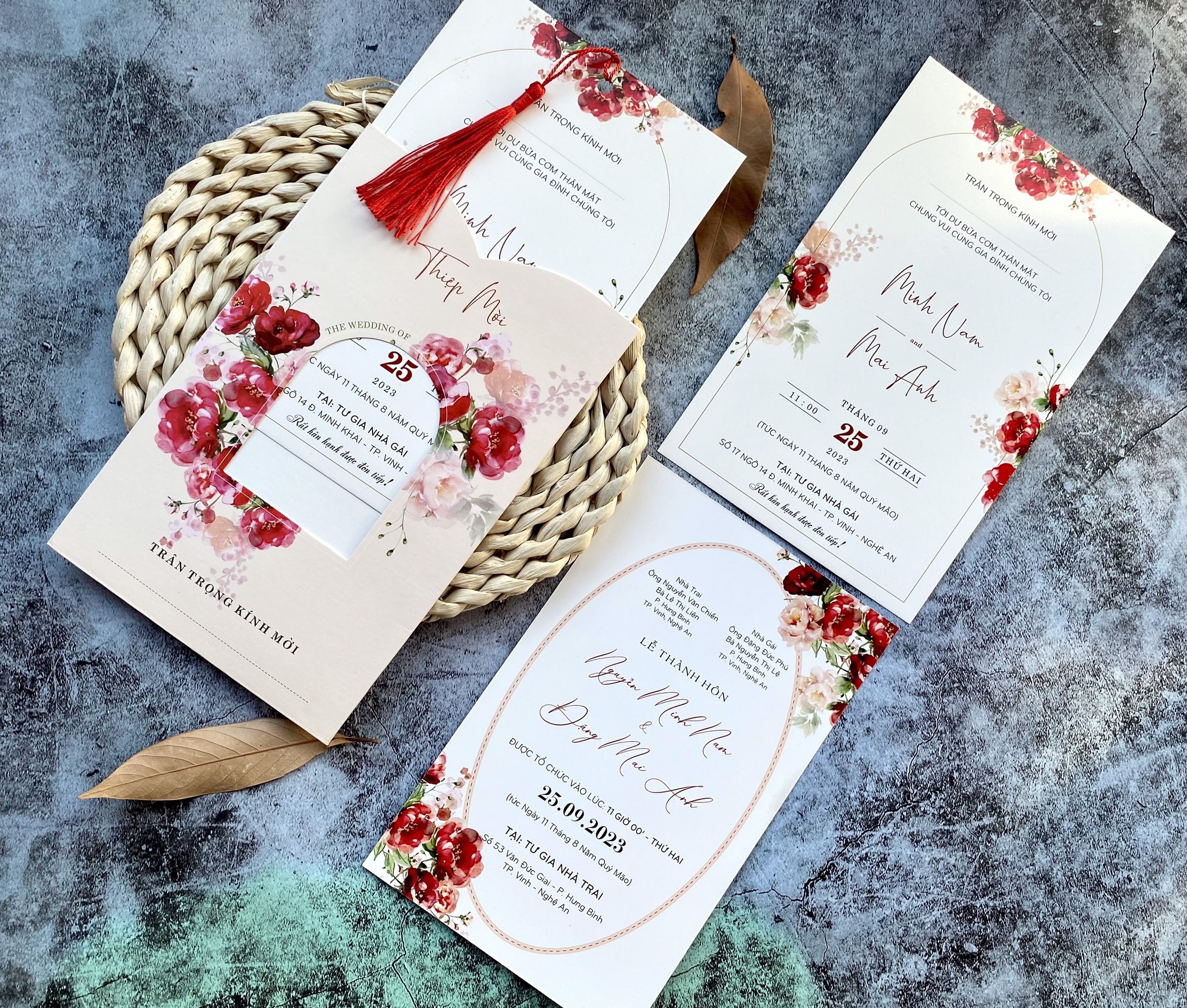 - Thành phần thiệp: Phong bì (Rút )+ 1 thiệp in 2 mặt + Nơ tua rua
