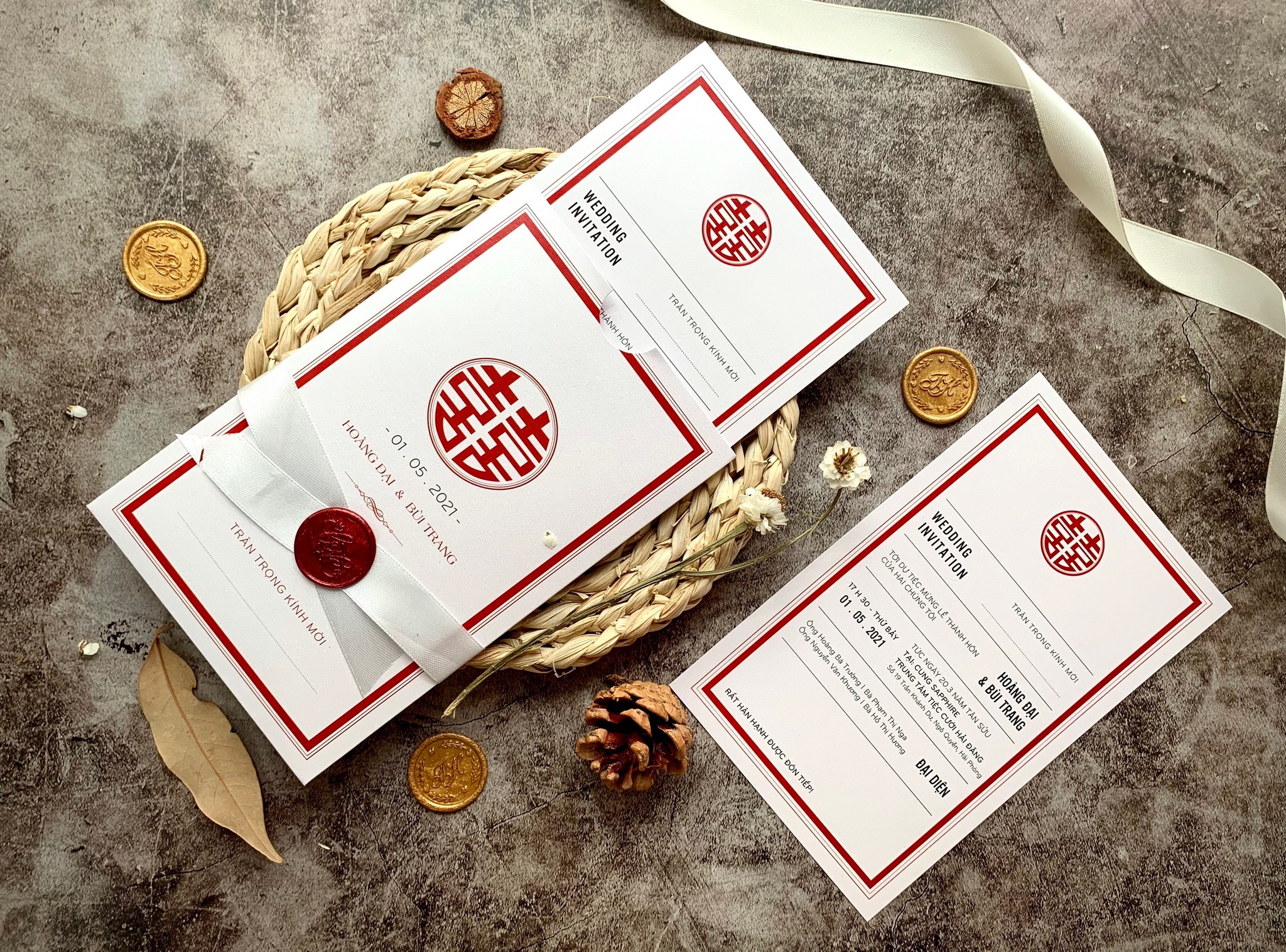 - Thành phần thiệp: Phong bì (Rút )+ 1 thiệp in 2 mặt + Nơ lụa đại + Dấu sáp (sẵn)